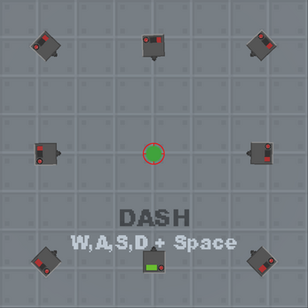 Players must avoid enemy projectiles by constantly dashing. Damage is delt to enemies the player dashes through. If the player loses three lives then the level restarts.